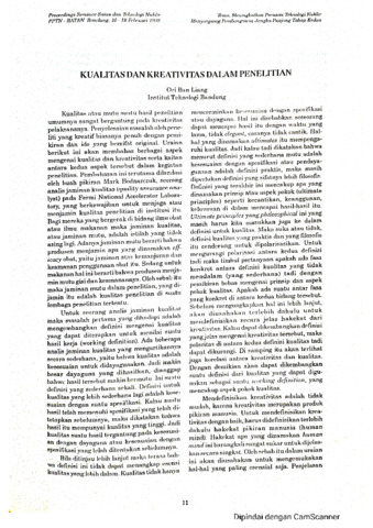 Kualitas atau mutu suatu hasil penelitian umumnya sangat bergantung pada kreativitas pelaksananya. Penyelesaian masalah oleh peneliti yang kreatif biasanya penuh dengan pemikiran dan ide yang bersifat original. Uraian berikut ini akan membahas berbagai aspek mengenai kualitas dan kreativitas serta kaitan antara kedua aspek tersebut dalam kegiatan penelitian. Pembahasan ini terutama dilandasi oleh buah pikiran Mark Bodnarezuk, seorang analis jaminan kualitas (quality assurance analyst) pada Fermi National Accelerator Laboratory, yang berkewajiban untuk menjaga atau menjamin kualitas penelitian di institusi itu.Bagi mereka yang bergerak di bidang ilmu obat atau ilmu makanan maka jaminan kualitas, atau jaminan mutu, adalah istilah yang tidak asing lagi. Adanya jaminan mutu berarti bahwa produsen menjamin apa yang dinamakan efficacy obat, yaitu jaminan atas kemanjuran dan keamanan penggunaan obat itu. Sedang untuk makanan hal ini berarti bahwa produsen menjamin mutu gizi dan keamanannya. Oleh sebab itu maka jaminan mutu dalam penelitian, yang dijamin itu adalah kualitas penelitian dì suatu lembaga penelitian tertentu.