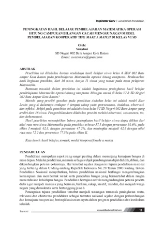 Sutarmi, Sutarmi (2022) Peningkatan hasil belajar pembelajaran matematika operasi hitung campuran bilangan cacah menggunakan model pembelajaran kooperatif tipe make a match di kelas VI SD. Inspirator Guru, 4 (6): 2. pp. 11-20. ISSN 2654-2536