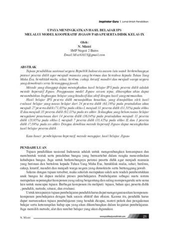 N., Mistri (2022) Upaya meningkatkan hasil belajar IPS melalui model kooperatif Jigsaw pada peserta didik kelas IX. Inspirator Guru, 4 (6): 3. pp. 21-30. ISSN 2654-2536