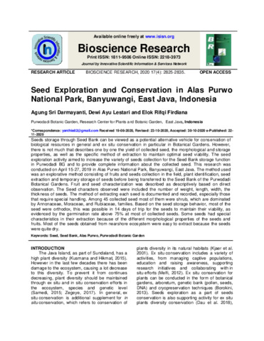 Agung, Sri Darmayanti and Dewi, Ayu Lestari and Elok, Rifki Firdiana (2020) Seed exploration and conservation in Alas Purwo National Park, Banyuwangi, East Java, Indonesia. Bioscience Research, 17 (4). pp. 2825-2835. ISSN 2218-3973