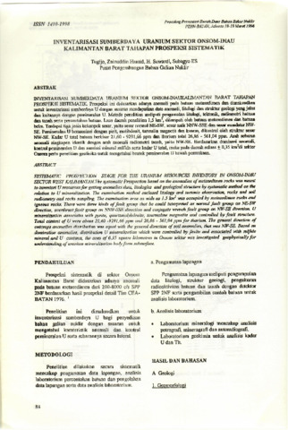 Prospeksi ini didasarkan adanya anomali pada batuan metasedimen dan dimaksudkan untuk inventarisasi sumberdaya U dengan sasaran mendapatkan data anomali, litologi dan struktur geologi yang jelas dan kaitannya dengan pemineralan U. Metode penelitian meliputi pengamatan litologi, tektonik, radiometri batuan dan tanah serta percontohan batuan. Luas daerah penelitian km2, ditempati oleh batuan metasedimen dan batuan beku. Terdapat tiga jenis kelompok sesar, yaitu sesar normal NE-SW, sesar naik NNW-SSE dan sesar mendatnr NWSE. Pemineralan U berasosiasi dengan pirit, molibdenit, tunnalin magnetit dan kuarsa, dikontrol oleh struktur sesar NW-SE. Kadar U total batuan berkisar 21 ,60 - 9291,66 ppm dan thorium total 26,86 - 561,04 ppm. Arah sebaran anomali singkapan identik dengan arah anomali radiometri tanah, yaitu NW-SE. Berdasarkan dominasi anomali, kontrol pemineralan U dan asosiasi mineral sulfida serta kadar U total, maka pada daerah seluas ± 0,35 km2di sektor Onsom perlu penelitian geofisika untuk mengetahui bentuk pemineralan U bawah pennukaan.