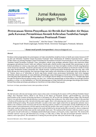 Sitta, Syawalia and Kiki, Prio Utomo and Dian, Rahayu Jati (2022) Perencanaan sistem penyediaan air bersih dari sumber air hujan pada kawasan permukiman kumuh Kelurahan Tambelan Sampit Kecamatan Pontianak Timur. Jurnal Rekayasa Lingkungan Tropis, 3 (1): 10. pp. 68-74. ISSN 2962-2158