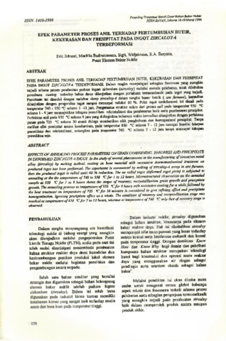 Dalam rangka mempelajari sebagian fenomena yang mungkin terjadi selama proses pembuatan paduan logam zirkonium (zircaloy) melalui metoda peleburan, telah dilakukan percobaan casting terhadap bahan dasar dilanjutkan dengan perlakuan termomekanik pada ingot Yang terjadi. Percobaan ini dimulai dengan melebur skrap zircaloy-4 dalam tungku busur listrik ( arc ftmace), kemudian dilanjutkan dengan pengerolan ingot sampai mencapai reduksi 60 %. Pelat ingot terdefonnasi ini dianil pada temperatur 740 930 oc selama I -12 jam. Pengamatan suuktur mikro dari proses anil pada temperatur 930 'C selama I - 9 jam menunjukkan tahapan pemulihan rekristalisasi dan pembesaran butir serta pembesaran presipitat. Perlakuan anil pada 930 oc selama 9 jam yang didinginkan beberapa waktu kemudian dilanjutkan dengan perlakuan panas pada 725 oc selama 30 menit diduga memberikan efek penghalusan dan homogenisasi presipitat. Tanpa melihat efek presipitat secara keseluruhan, pada temperatur 850 oc selama 7 - 12 jam tercapai kondisi tahapan pemulihan dan rekristalisasi, sedangkan pada temperatur 740 ec selama 7 12 jam hanya mencapai tahapan pemulihan saja.