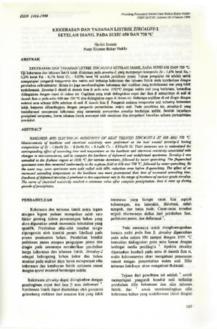 Uji kekerasan dan tahanan listrik telah dilakukan pada zircaloy-2 yang mempunyai komposisi Zr - 1,6% berat Sn; 0.2% berat Fe; - 0.1% berat Cr. - 0.05% berat Ni setelah perlakuan panas. Tujuan pengujian ini adalah untuk mempelajari pengaruh temperatur dan waktu anil terhadap kekerasan dan tahanan listrik serta korelasinya dengan perubahan mikrostruktur. Selain itu juga membandingkan kekerasan dari cuplikan yang terdefonnasi dan yang tidak terdeformasi. Zircaloy-2 dianil di daerah fasa ß pada suhu 10500C dengan waktu anil yang berlainan, kemudian didinginkan dengan cepat di dalatn air. Cuplikan yang telah didinginkan cepat dari fasa selanjutnya di anil di daerah fasa a pada suhu 650 dan 750 oc dan didinginkan cepat di dalam air. Beberapa cuplikan di rol dingin dengan reduksi area sebesar 60% sebelum di anil di daerah fasa p. Pengaruh naiknya temperatur anil terhadap kekerasan lebih berperan dibandingkan dengan pengaruh pertambahan waktu anil. Pada penelitian ini, zircaloy-2 yang terdefonnasi mempunyai kekerasan yang memenuhi persyaratan zircaloy berderajat nuklir. Setelah teöadinya presipitasi sempurna, kurva tahanan listrik mencapai titik minimum dan mengalami kenaikan selama pertumbuhan presipitat.
