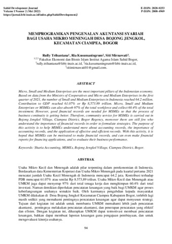 Rully, Trihantana and Ria, Kusumaningrum and Siti, Mirnawati (2022) Memprogramkan pengenalan akuntansi syariah bagi usaha mikro menengah Desa Bojong Jengkol, Kecamatan Ciampea, Bogor. Sahid Development Journal, 1 (2): 12. pp. 94-102. ISSN 2808-4969