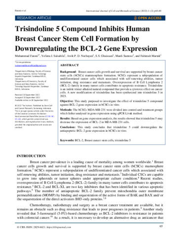 Muhammad, Fatoni and Yofinta, I. Salsabila and Awik, P. D. Nurhayati and S., S. Ghaissani and Mardi, Santoso and Fahimah, Martak (2022) Trisindoline 5 compound inhibits human breast cancer stem cell formation by downregulating the BCL-2 gene expression. Internasional Journal of Cell and Biomedical Science, 1 (2): 4. pp. 65-69. ISSN 2829-6621
