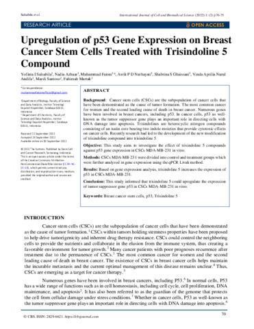 Yofinta, I Salsabila and Nadia, Azhaar and Muhammad, Fatoni and Awik, P D Nurhayati and Shabrina, S Ghaissani and Vinda, Aprilia Nurul Andifa and Mardi, Santoso and Fahimah, Martak (2022) Upregulation of p53 gene expression on breast cancer stem cells treated with trisindoline 5 compound. Internasional Journal of Cell and Biomedical Science, 1 (2): 5. pp. 70-75. ISSN 2829-6621