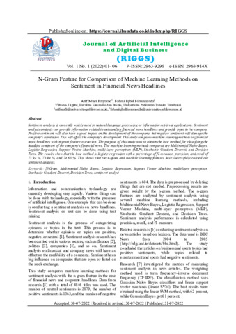 Arif, Mudi Priyatno and Fahmi, Iqbal Firmananda (2022) N-Gram feature for comparison of machine learning methods on sentiment in financial news headlines. Journal of Artificial Intelligence and Digital Business, 1 (1): 1. pp. 1-6. ISSN 2963-9298