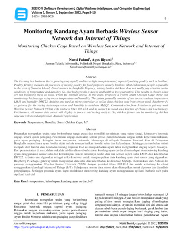 Nurul, Fahmi and Agus, Riyanti (2022) Monitoring kandang ayam berbasis wireless sensor network dan Internet of Things. Software Development, Digital Business Intelligence, and Computer Engineering, 1 (1): 2. pp. 9-13. ISSN 2963-9026