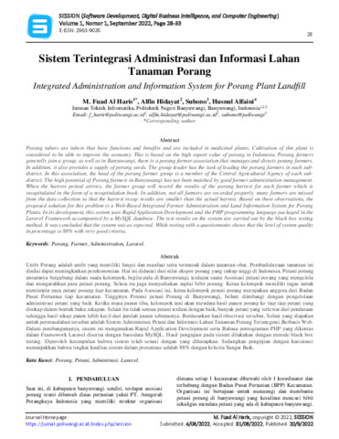 M., Fuad Al Haris and Alfin, Hidayat and Subono, Subono and Husnul, Alfaini (2022) Sistem terintegrasi administrasi dan informasi lahan tanaman porang. Software Development, Digital Business Intelligence, and Computer Engineering, 1 (1): 5. pp. 28-33. ISSN 2963-9026