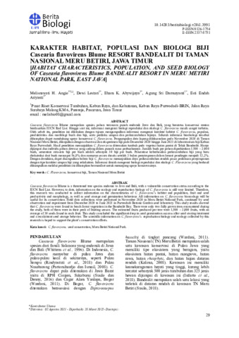 Melisnawati, H. Angio and Dewi, Lestari and Ilham, Kurnia Abiwijaya and Agung, Sri Darmayanti (2022) Karakter habitat, populasi dan biologi biji Casearia flavovirens Blume Resort Bandealit Di Taman Nasional Meru Betiri, Jawa Timur. Berita Biologi: Jurnal Ilmu-Ilmu Hayati, 20 (3). pp. 29-42. ISSN 0126-1754