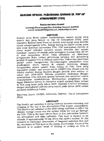 Radiasi netto Bumi adalah keseimbangan antara energi yang masuk dan yang keluar di Top Of Atmosphere (TOA) (atas atmosfer). Radiasi netto Bumi ini adalah total energi yang tersedia untuk mempengaruhi iklim. Energi datang ke dalam sistem pada saat sinar matahari menembus TOA. TOA merupakan lapisan di mana terjadi interaksi pertama antara atmosfer dan radiasi matahari. Lapisan ini berada pada ketinggian kurang lebih 20 km di atas permukaan Bumi. Pada penelitian ini dilakukan pengamatan fluks radiasi gelombang panjang dan gelombang pendek di lapisan TOA di wilayah Indonesia. Fokus dan penelitian adalah untuk menganalisis kecenderungan pemanasan atau pendinginan suatu daerah di wilayah Indonesia dengan menganalisis secara spasial fluks radiasi di TOA. Data yang digunakan adalah dan sensor-satelit CERES (The Clouds and the Earth's Radiant Energy System) dengan periode data sekitar 11 tahun dari 2000-2010. Metoda penelitian dilakukan dengan menentukan nilai rata-rata spasial bulan.an dan musiman untuk menunjukkan variabilitasnya. Berdasarkan pengolahan data, dapat diketahui bahwa di Indonesia terjadi anomali fluks radiasi di TOA yang besar pada tahun 2006. Anomali tersebut berkaitan dengan peningkatan polutan yang terjadi pada tahun 2006 akibat peristiwa kebakaran hutan.