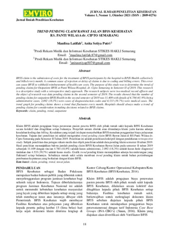 Maulina, Latifah and Anita, Setiya Putri (2021) Trend pending claim rawat jalan BPJS Kesehatan RS. Panti Wilasa dr. Cipto Semarang. Emviro: Jurnal Ilmiah Penelitian Kesehatan, 1 (1): 3. pp. 18-24. ISSN 2809-0276