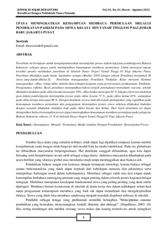 Suwirah, Suwirah (2022) Upaya meningkatkan kemampuan membaca permulaan melalui pendekatan paikem pada siswa kelas 1 SDN Tanah Tinggi 01 Pagi Johar Baru Jakarta Pusat. Jurnal Ki Hajar Dewantara, 1 (1): 1. pp. 1-21. ISSN 2828-5158