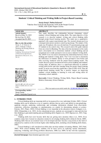 Suteja, Suteja and Dadan, Setiawan (2022) Students' critical thinking and writing skills in project-based learning. International Journal of Educational Qualitative Quantitative Research (IJE-QQR), 1 (1): 3. pp. 16-22. ISSN 2962-9918