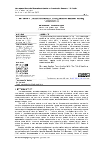 Siti, Maesaroh and Mumu, Muzayyin (2022) The effect of critical multiliteracy learning model on students' reading comprehension. International Journal of Educational Qualitative Quantitative Research (IJE-QQR), 1 (1): 5. pp. 28-33. ISSN 2962-9918