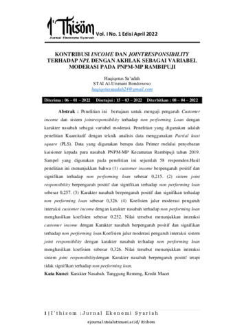 Haqiqotus, Sa’adah (2022) Kontribusi income dan jointresponsibility terhadap NPL dengan akhlak sebagai variabel moderasi pada PNPM-MP Rambipuji. I'Thisom : Jurnal Ekonomi Syariah, 1 (1): 1. pp. 1-18. ISSN 2963-1653