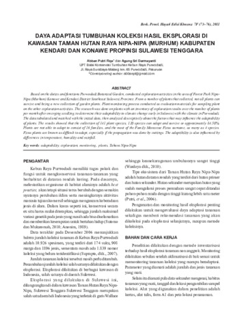 Abban, Putri Fiqa and Agung, Sri Darmayanti (2011) Daya adaptasi tumbuhan koleksi hasil eksplorasi di kawasan Taman Hutan Raya Nipa-Nipa (Murhum) Kabupaten Kendari dan Konawe Propinsi Sulawesi Tenggara. Berkala Penelitian Hayati, Edisi khusus, 7 (F). pp. 73-76. ISSN 2337-389X