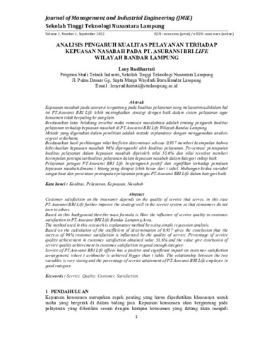 Leny, Rudihartati (2022) Analisis pengaruh kualitas pelayanan terhadap kepuasan nasabah pada PT. asuransi BRI Life wilayah Bandar Lampung. Journal of Management and Industrial Engineering (JMIE), 1 (1): 1. pp. 1-12. ISSN 2962-9144