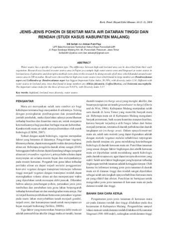 Siti, Sofiah and Abban, Putri Fiqa (2010) Jenis-jenis pohon di sekitar mata air dataran tinggi dan rendah (studi kasus Kabupaten Malang). Berkala Penelitian Hayati Edisi Khusus, 4 (A). pp. 1-3. ISSN 2337-389X