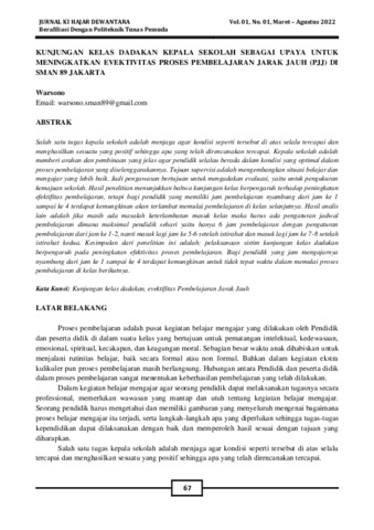 Warsono, Warsono (2022) Kunjungan kelas dadakan kepala sekolah sebagai upaya untuk meningkatkan evektivitas proses pembelajaran jarak jauh (PJJ) di SMAN 89 Jakarta. Jurnal Ki Hajar Dewantara, 1 (1): 5. pp. 67-88. ISSN 2828-5158