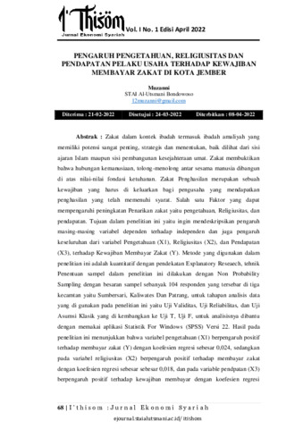 Muzanni, Muzanni (2022) Pengaruh pengetahuan, religiusitas dan pendapatan pelaku usaha terhadap kewajiban membayar zakat di Kota Jember. I'Thisom : Jurnal Ekonomi Syariah, 1 (1): 5. pp. 68-80. ISSN 2963-1653