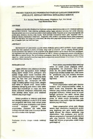 Telah dilakukan pembuatan paduan logam zirkonium (zircaloy) dari erbuk zirkonium ditambah serbuk unsur-unsur pemadunya malalui teknik metalurgi serbuk. Parameter proses yang mempengaruhi sifat produk sinter, khususnya densitas, telah diamati. Hasi! percobaan menunjukkan bahwa pada temperatur 1100 C, pengaruh tekanan pengompakan relatif kecil. Pengamatan mikro struktur menunjukkan bahwa proses penyinteran terdiri dari tiga tahap, yaitu tahap awal, tahap antara, dan tahap akhir yang terjadi masing-masing antara I sampai 2,5 jam, 2,5 ampai 6 jam, dan lebih dari 6 jam.
