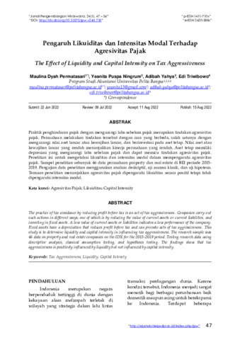 Maulina, Dyah Permatasari and Yeanita, Puspa Ningrum and Adibah, Yahya and Edi, Triwibowo (2022) Pengaruh likuiditas dan intensitas modal terhadap agresivitas pajak. Jurnal Pengembangan Wiraswasta, 24 (1): 5. pp. 47-56. ISSN 1411-710X