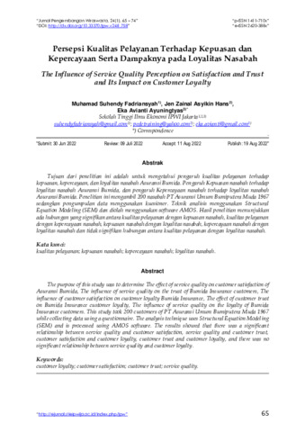Muhamad, Suhendy Fadriansyah and Jen, Zainal Asyikin Hans and Eka, Avianti Ayuningtyas (2022) Persepsi kualitas pelayanan terhadap kepuasan dan kepercayaan serta dampaknya pada loyalitas nasabah. Jurnal Pengembangan Wiraswasta, 24 (1): 7. pp. 65-74. ISSN 1411-710X