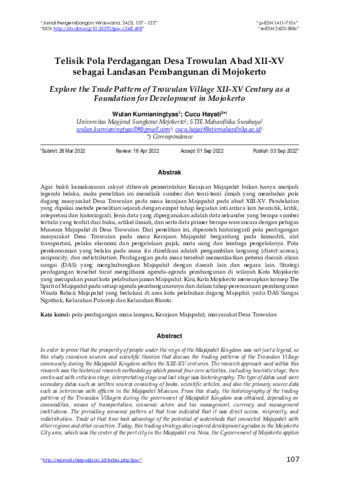 Wulan, Kurnianingtyas and Cucu, Hayati (2022) Telisik pola perdagangan Desa Trowulan abad XII-XV sebagai landasan pembangunan di Mojokerto. Jurnal Pengembangan Wiraswasta, 24 (2): 4. pp. 107-122. ISSN 1411-710X