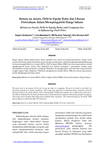 Sugoto, Sulistyono and Lina, Maretasari and SM, Parulian Tanjung and Eka, Giovana Asti (2022) Return on assets, debt to equity ratio dan ukuran perusahaan dalam mempengaruhi harga saham. Jurnal Pengembangan Wiraswasta, 24 (2): 5. pp. 123-132. ISSN 1411-710X