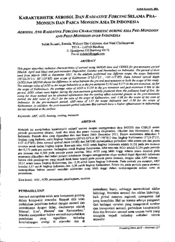 Makalah ini menjelaskan karakteristik radiatif aerosol dengan menggunakan data MODIS dan CERES untuk periode pra-monsun (Maret, April dan Mei) dan pasca monsun (September, Oktober dan November) di atas Indonesia. Periode data yang digunakan dari dari Maret 2000- Desember 2011. Dalam analisisnya dilakukan 2 lingkup yang berbeda, yaitu lingkup Indonesia (20°LS-20°LU, 80°-150°BT) dam lingkup Kalimantan (3°LS-2°LU, 110°-115°BT). Data Aerosol optical depth (AOD) dari MODIS menunjukkan perbedaan nilai antara pra dan pasca monsun untuk kedua lingkup kajian. Rata-rata nilai AOD untuk lingkup Indonesia adalah 0,152 pada pra monsun dan 0,175 pada pra monsun. Sedangkan untuk lingkup Kalimantan, nilai rata-rata AOD adalah 0,134 pada periode pra monsun dan 0,366 pada periode pasca monsun. Nilai AOD yang lebih tinggi selama pasca monsun pada umumnya dihasilkan dari beban polutan kebakaran. Dengan menggunakan slope method dapat diperoleh informasi bahwa efek pendinginan yang terjadi lebih besar terjadi pada periode pasca monsun, dengan nilai ARF sebesar -20,11 untuk kasus lingkup Kalimantan, dan -5,38 untuk kasus lingkup Indonesia. Pada periode pra monsun, ARF bernilai 3,57 untuk lingkup Indonesia dan -5,38 untuk lingkup Kalimantan. Selain itu, pada periode pasca monsun menunjukkan bahwa aerosol memiliki efektivitas yang lebih tinggi dalam mempengaruhi radiasi netto di permukaan.