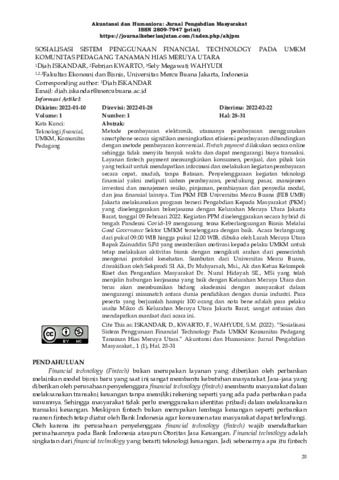 Diah, Iskandar and Febrian, Kwarto and Sely, Megawati Wahyudi (2022) Sosialisasi sistem penggunaan financial technology pada UMKM komunitas pedagang tanaman hias Meruya Utara. Akuntansi dan Humaniora: Jurnal Pengabdian Masyarakat, 1 (1): 4. pp. 28-31. ISSN 2809-7947