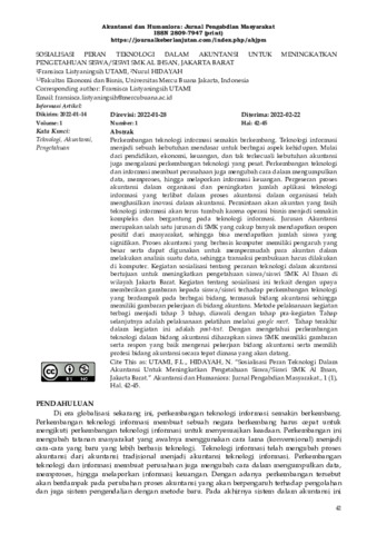 Fransisca, Listyaningsih Utami and Nurul, Hidayah (2022) Sosialisasi peran teknologi dalam akuntansi untuk meningkatkan pengetahuan siswa/siswi SMK Al-Ihsan, Jakarta Barat. Akuntansi dan Humaniora: Jurnal Pengabdian Masyarakat, 1 (1): 7. pp. 42-45. ISSN 2809-7947