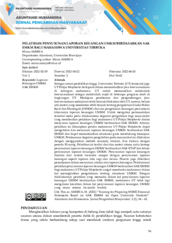 Mirna, Amirya (2022) Pelatihan penyusunan laporan keuangan UMKM berdasarkan SAK EMKM bagi mahasiswa Universitas Terbuka. Akuntansi dan Humaniora: Jurnal Pengabdian Masyarakat, 1 (2): 2. pp. 56-62. ISSN 2809-7947