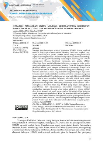 Aldina, Shiratina and Ngadino, Surip (2022) Strategi pemasaran untuk menjaga keberlanjutan kehidupan UMKM peran motivasi dan teknologi di era pandemi Covid-19. Akuntansi dan Humaniora: Jurnal Pengabdian Masyarakat, 1 (2): 3. pp. 63-68. ISSN 2809-7947