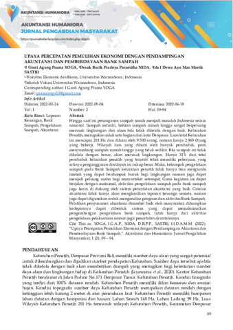 I, Gusti Agung Prama Yoga and Desak, Rurik Pradnya Paramitha Nida and Ida, I Dewa Ayu Mas Manik Sastri (2022) Upaya percepatan pemulihan ekonomi dengan pendampingan akuntansi dan pemberdayaan bank sampah. Akuntansi dan Humaniora: Jurnal Pengabdian Masyarakat, 1 (2): 7. pp. 89-94. ISSN 2809-7947