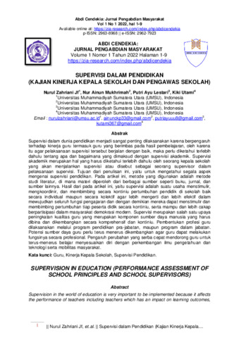 Nurul, Zahriani and Nur, Ainun Mukhrimah and Putri, Ayu Lestari and Kiki, Utami Supervisi dalam pendidikan (kajian kinerja kepala sekolah dan pengawas sekolah). Abdi Cendekia: Jurnal Pengabdian Masyarakat, 1 (1): 1. pp. 1-9. ISSN 2963-8968