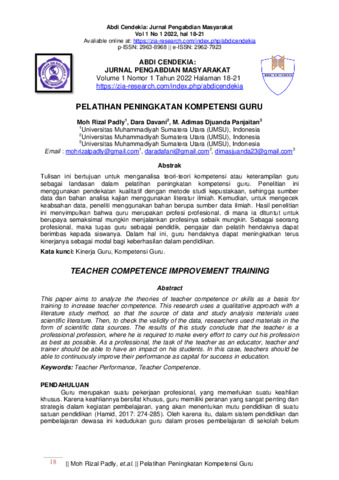 Moh, Rizal Padly and Dara, Davani and M. Adimas, Djuanda Panjaitan Pelatihan peningkatan kompetensi guru. Abdi Cendekia: Jurnal Pengabdian Masyarakat, 1 (1): 3. pp. 18-21. ISSN 2963-8968
