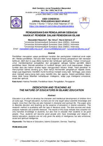 Mawaddah, Nasution and Nur, Ainun and Nurul, Zahriani (2022) Pengabdian dan pengajaran sebagai hakikat pendidik dalam pendidikan Islam. Abdi Cendekia: Jurnal Pengabdian Masyarakat, 1 (1): 5. pp. 27-33. ISSN 2963-8968