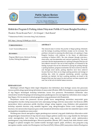 Theodora, Thessa Renata Putri and Sri, Umiyati and Budi, Rianto (2022) Efektivitas program e-parking dalam pelayanan publik di Taman Bungkul Surabaya. Public Sphere Review: Journal of Public Administration, 1 (1): 1. pp. 1-8. ISSN 2963-9476