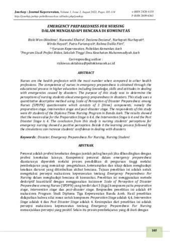 Rizki, Wan Oktabina and Nuswatul, Khaira and Desiana, Desiana and Nurhayati, Nurhayati and Wirda, Hayati and Putra, Furiansyah and Rahma, Dalila Fitri (2022) Emergency preparedness for nursing dalam menghadapi bencana di komunitas. Journal Keperawatan, 1 (2): 6. pp. 105-114. ISSN 2809-6363