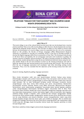 Ni, Wayan Suastini and Ni, Putu Cahyani Putri Utami and Desak, Putu Eka Pratiwi and Ni, Kadek Kurnia Nareswari Dewi (2022) Pelatihan “English for tour guiding” bagi kelompok sadar wisata (pokdarwis) Desa Tista. Bina Cipta, 1 (1): 1. pp. 1-9. ISSN 2962-7885