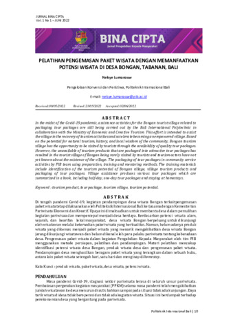 Nelsye, Lumanauw (2022) Pelatihan pengemasan paket wisata dengan memanfaatkan potensi wisata di Desa Bongan, Tabanan, Bali. Bina Cipta, 1 (1): 2. pp. 10-16. ISSN 2962-7885