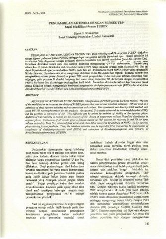 Studi terhadap modifikasi proses PUREX dilakukan dengan tujuan perluasan proses PUREX sehingga dapat mengambil aktinida bervalensi tiga.. Dalam penelitian ini (Nd) digunakan sebagai pengganti aktinida bervalensi tiga seperti amerisium (Am) dan curium (Cm). Percobaan dilakukan secara catu, dan analisis dilakukan menggunakan iJü-ihS spektrometä. Seperti yang diharapkan U mudah diekstraksi oleh tri-n-butil fosfat (TBP), tetapi masalah terdapat pada ekstraksi Nd. Ha/ ini dapat dipecahkan dengan menambahkan NaN03 pada fase air. Penambahan O,2M NaN03 cukup untuk mengambil Nd dari fase air. Kenaikan suhu akan mengurangi distribusi U dan Nd dalam fase organik. Evaluasi seluruh data menghasilkan sebuah proses dinamakan proses TBP untuk pengambilan U dan Nd (atau aktinida bervalensi tiga) sekaligus, yaitu pertama U diambil langsung dari asam nitrat, kemudian Nd diekstraksi dengan menambahkan NaN03 ke dalam fase air sehingga meninggalkan hasil belah. Pemisahan aktinida bervalensi tiga dan unsur tanah jarang dilakukan dengan menggunakan kombinasi pengompleks diethylenepentaacetic acid (DIVA) dan ekstraktan diisodecylphosphoric acid (DIDPA) atau diethylhexylphsophoric acid