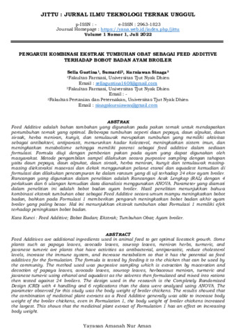 Sella, Gustina and Sumardi, Sumardi and Kurniawan, Sinaga (2022) Pengaruh kombinasi ekstrak tumbuhan obat sebagai feed additive terhadap bobot badan ayam broiler. Jurnal Ilmu Teknologi Ternak Unggul (JITTU), 1 (1): 3. pp. 15-21. ISSN 2962-9446