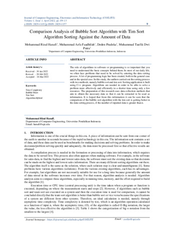Mohammad, Rizal Hanafi and Muhammad, Azfa Faadhilah and Deden, Pradeka and Muhammad, Taufik Dwi Putra (2022) Comparison analysis of bubble sort algorithm with tim sort algorithm sorting against the amount of data. Journal of Computer Engineering, Electronics and Information Technology, 1 (1): 2. pp. 9-13. ISSN 2829-4157