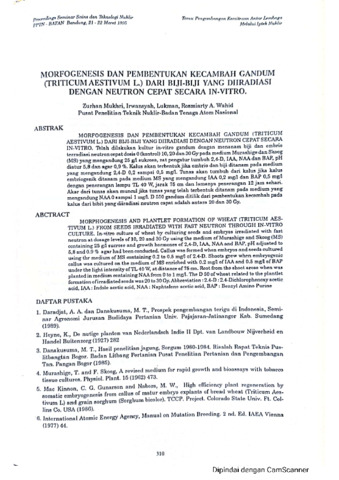 Telah dilakukan kultur in-vitro gandum dengan menanam biji dan embrio terradiasi neutron cepat dosis 0 (kontrol) 10,20 dan 30 Gy pada medium Murashige dan Skoog (MS) yang mengandung 25 g/l sukrosa, zat pengatur tumbuh 2,4-D, IAA, NAA dan BAP, pH diatur 5.8 dan agar 0,9 %. Kalus akan terbentuk jika embrio dan biji ditanam pada medium yang mengandung 2,4-D 0,2 sampai 0.5 mg/l. Tunas akan tumbuh dari kalus jika kalus embriogenik di tanam pada medium MS yang mengandung IAA 0,2 mg/1 dan BAP 0,5 mg/1 dengan penerangan lampu TL 40 W, jarak 75 cm dan lamanya penerangan 12 jam sehari. Akar darí tunas akan muncul jika tunai yang telah terbentuk di tanam pada medium yang mengandung NAA 0 sampai 1 mg/l. D 550 gandum ditilik dari pembentukan kecambah pada kalus dari bibit yang diiradiasi neutron cepat adalah antara 20 dan 30 Gy.