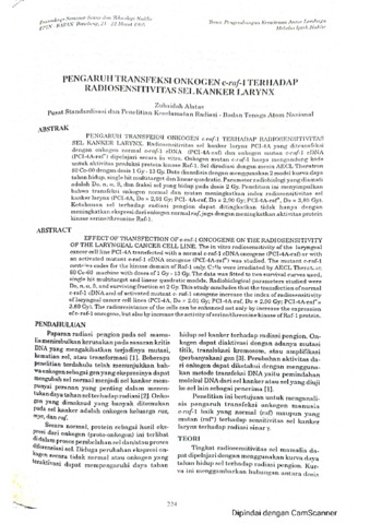 Radiosensitivitas sel kanker larynx PCI-4A yang di transfeksi dengan onkogen normalc-raf-1 cDNA (PCI-4A-raf) dan onkogen mutan c-raf-1 cDNA (PCI-4A-raf⁺⁺) dipelajari secara in-vitro. Onkogen muatan c-raf-1 hanya mengandung kode untuk aktivitas produksi protein kinase Raf-1. Sel diradiasi dengan mesin AECL Theratron 80 Co-60 dengan dosis 1 Gy- 13 Gy. Data dianalisis dengan menggunakan dua model kurva daya tahan hidup, Single hit multi targetdan linear quadratic. Parameter radiobiologi yang diamati adalah Do, n, α, β dan fraksi sel yang hidup Pada dosis 2 Gy. Penelitian ini menyimpulkan bahwa transfeksi onkogen normal dan mutan meningkatkan index radiosensitivitas Sel kanker larynx (PCI-4A, Do = 2,01 Gy, PCI-4A-raf, Do = 2,90 Gy, PCI-4A-raf⁺⁺, Do = 3.80 Gy). Ketahanan sel terhadap radiasi Pengion dapat ditingkatkan tidak hanya dengan meningkatkan ekspresi dari onkogen normal raf, juga dengan meningkatkan aktivitas protein kinase serine. Threonine Raf-1.
