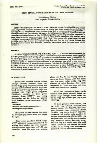 Senyawa Ba2NdU06 adalah suatu senyawa penting yang terbentuk pada proses pemadatan limbah cair aktivitas tinggi dengan menggunakan metoda temperatur super tinggi (MTST), yang mempunyai struktur Perovskite teratur. Studi ini bertujuan mempelajari tingkat oksidasi U pada senyawa Ba2NdtJ06. Telah dipelajari sifat senyawa dengan menggunakan magnetometer torsi tipe Faraday dan Spektrometer Fotoelektron Sinar X (XPS). Suseptibilitas magnetik yang diukur pada temperatur 4 K sampai dengan temperatur ruang, menunjukkan bahwa Ba2NdU06 bersifat paramagnetik yang memenuhi aturan Curie-Weiss. Momen magnet efektif BaaNdtJ06 adalah 3.04pB . Dari spektrum XPS, puncak-puncak U4f untuk BazNdU06 muncul tepat di antara puncak-puncak energi ikat untuk U02 dan U03. Dengan demikian dapat disimpulkan bahwa uranium dalam Ba2NdU06 mempunyai puncak-puncak energi ikat sama dengan uranium bervalensi +5.